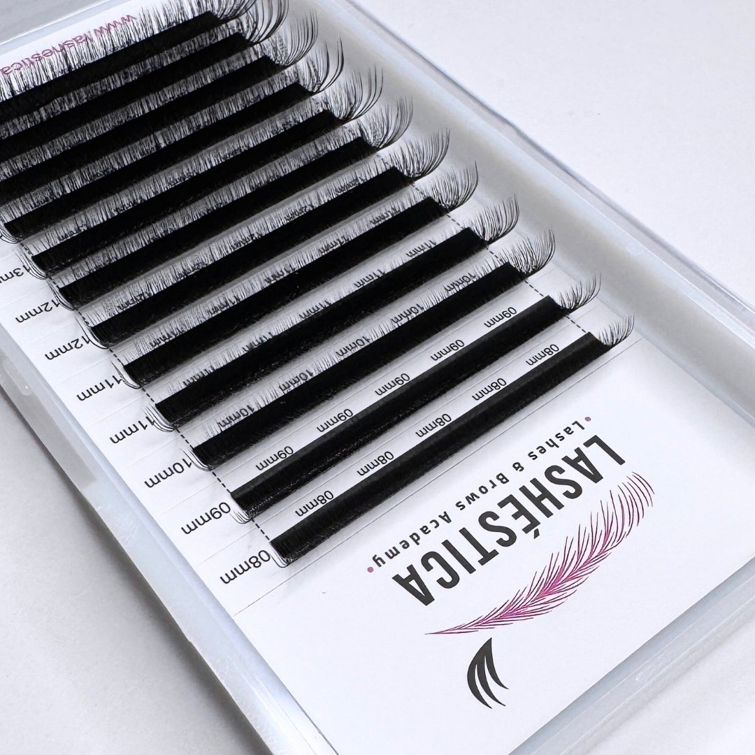 Blister de pestañas sintéticas elaboradas con fibra PBT, suaves y flexibles.